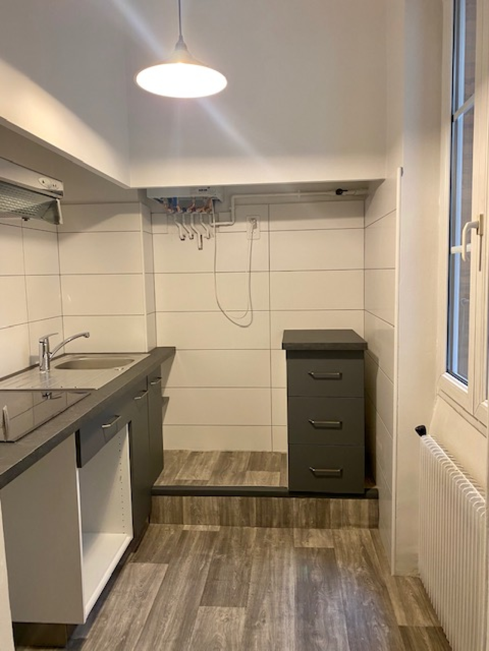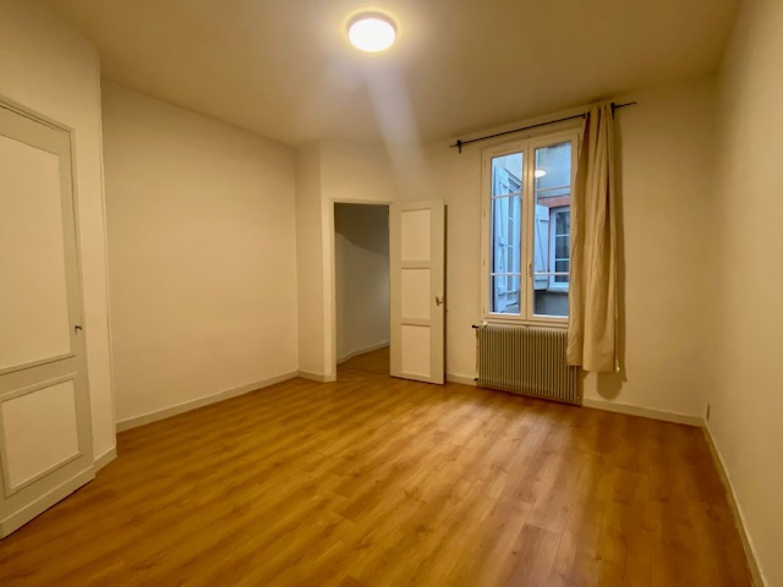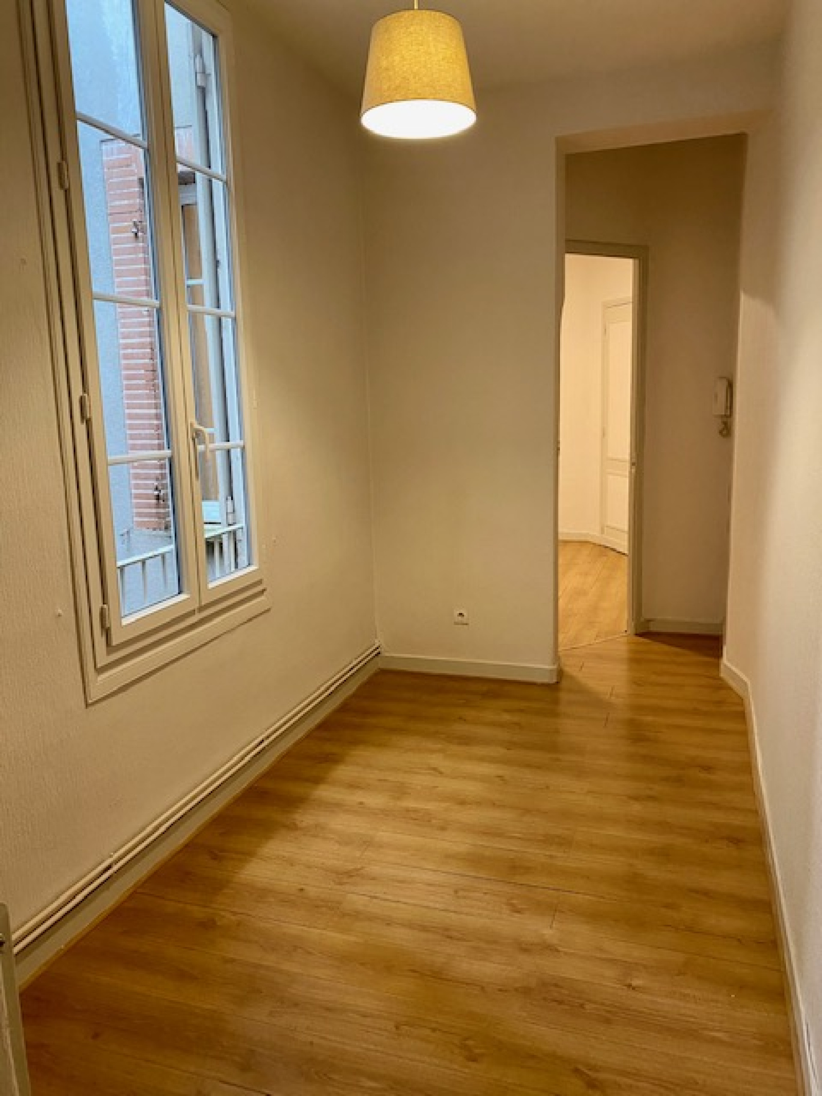Entrée, salon au calme donnant sur cour, cuisine séparée, coin salle à manger/bureau, très grande chambre d'environ 20m2 avec rangements.