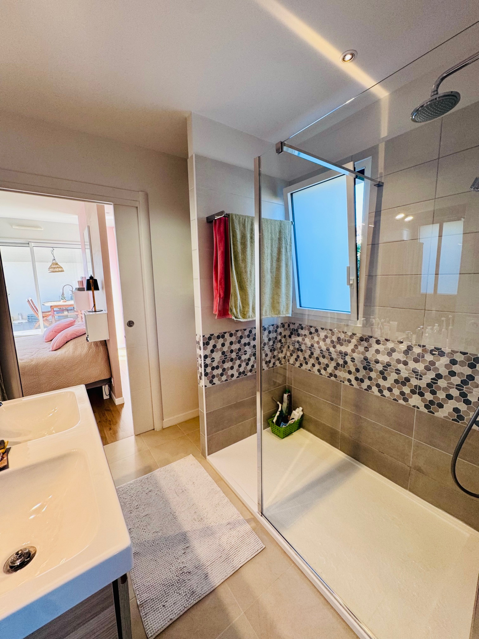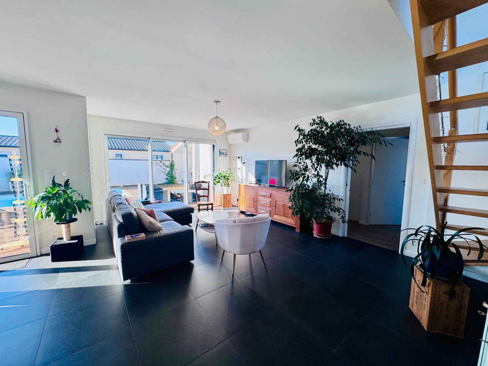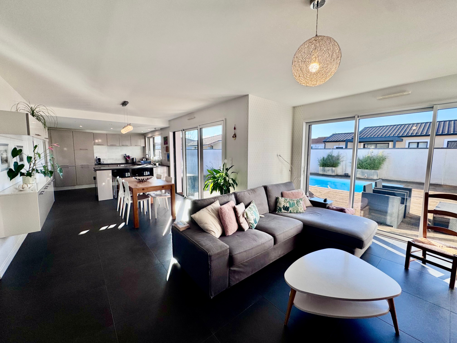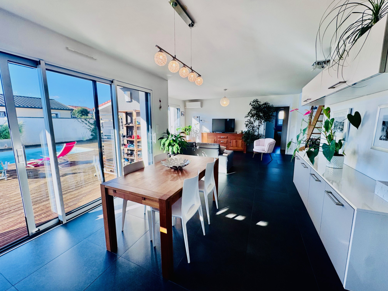 Découvrez cette maginifique villa contemporaine de 140m2 construite en 2014, entretenue avec grand soin, ce qui lui confère aujourd'hui un état comme neuf. Elle se situe dans un lotissement calme et à proximité des écoles et commerces. Le rez de chaussée est totalement indépendant, avec sa pièce de vie s'ouvrant sur la terrasse et la piscine, ainsi que deux chambres, une salle d'eau et un bureau avec accès indépendant. A l'étage, deux chambres, une salle de bains et un WC. Cette maison offre un cadre de vie lumineux et fonctionnel pour une famille avec tout le confort énergétique actuel (pompe à chaleur, climatisation, panneaux photovoltaiques), ses aménagements extérieurs (piscine, terrasse en bois, pool house) et son excellent état général. A visiter sans tarder ! Contactez Immobilier du Palais Valérie 06 15 27 27 45 ou Clémence 06 23 17 37 98